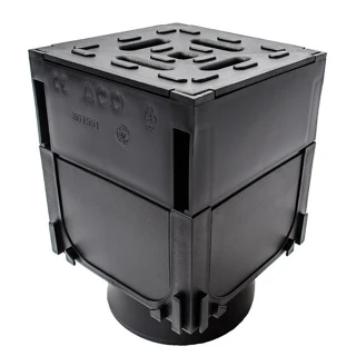 ACO HEXDRAIN CORNER UNIT WITH BLACK PLASTIC GRATING & VERTICAL OUTLET 125x125x125MM